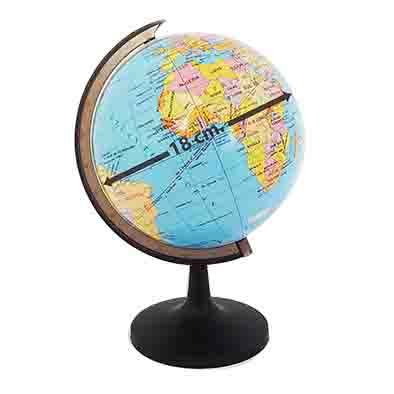 ลูกโลก ขนาด 18 ซม. ใช้ในการศึกษาภูมิศาสตร์ ทำให้มองเห็นภาพรวมของขนาดและอาณาเขตของมหาสมุทร ทะเล เกาะ และประเทศต่าง ๆ ในโลก ลูกโลกจำลอง ขนาด 18 ซม. มีสีสันสดใส แบ่งอาณาเขตของประเทศอย่างชัดเจน แสดงชื่อประเทศ เมืองหลวง และเมืองสำคัญเป็นภาษาอังกฤษด้วยตัวอักษรที่ชัดเจนและอ่านง่าย และยังมีสเกลตัวเลขบอกองศาของเส้นรุ้งและเส้นแวงอีกด้วย สามารถใช้เพื่อศึกษาลักษณะทางภูมิศาสตร์ สามารถใช้เป็นอุปกรณ์ตกแต่งบ้านและอาคาร และให้เป็นของขวัญได้อีกด้วย