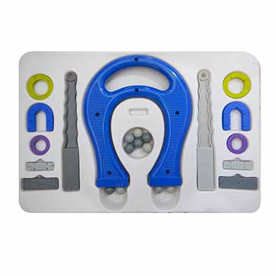 ชุดแม่แหล็ก 6 แบบ สีสันสดใส จำนวนทั้งหมด 23 ชิ้น ประกอบด้วยแม่เหล็กเกือกม้า 1 ชิ้น, แม่เหล็กรูปตัวยู 2 ชิ้น, แม่เหล็กวงแหวน 4 ชิ้น, แม่เหล็กสี่เหลี่ยม 4 ชิ้น, แท่งแม่เหล็ก 2 ชิ้น และลูกกลมแม่เหล็ก 10 ชิ้น ภายในชุดมีคู่มือนำกิจกรรมและเกร็ดความรู้เรื่องแม่เหล็ก สามารถนำไปใช้ทำกินกรรมได้อย่างหลากหลาย เช่น กิจกรรมแย่งประเภทสิ่งของด้วยแม่เหล็ก, กิจกรรมแรงดูดและแรงผลักขั้วแม่เหล็ก, เกมตกปลา และแม่เหล็กลอยได้ เป็นต้น เหมาะในการใช้ประกอบการเรียนการสอนวอทยาศาสตร์ในห้องเรียนหรือเรียนรู้นอกเวลา