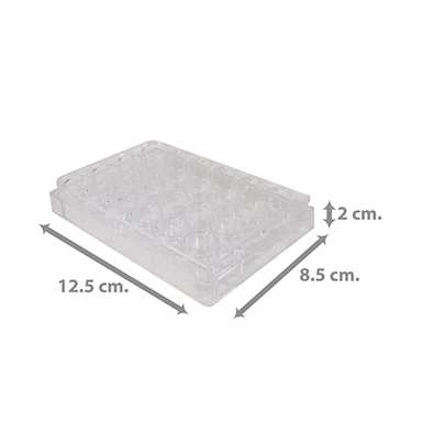 ถาดหลุมพลาสติก 24 ช่อง ทำจากพลาสติกใส สังเกตผลการทดลองเห็นชัดเจน ใช้ในการทดลองหรืองานสเกลขนาดเล็กที่ไม่สามารถใช้บีกเกอร์ หลอดทดลอง หรือภาชนะขนาดใหญ่ได้ และใช้ในการทดลองที่ต้องการเปรียบเทียบตัวอย่างหลายๆตัวอย่างพร้อมกัน เช่น การตกตะกอนสาร, การเกิดปฏิกิริยาเคมี, การทดสอบค่า pH