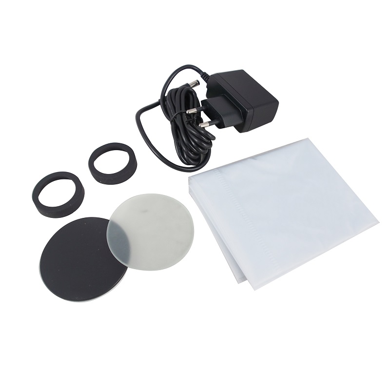 อุปกรณ์ในชุด: ยางครอบเลนส์ตา, แผ่นรองวัตถุสีขาว/ดำ และแบบโปร่งแสง, สาย Adapter, ถุงคลุมกล้อง